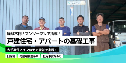 躯体/型枠大工、躯体/鉄筋工、躯体/雑工、左官(土間)、土工、重機オペレーター、エクステリア・外構