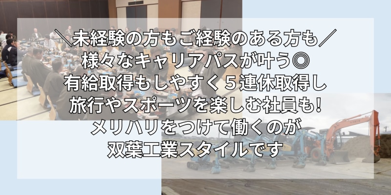 ◎未経験からの挑戦を応援する柔軟なキャリアプラン 株式会社双葉工業では、未経験からスタートできる環境を整えています。施工管理補助か職人スタートを選べる柔軟な働き方が特徴で、自分に合ったキャリアを築けます。先輩社員がマンツーマンで指導するため、経験がなくても安心です。 ◎働きやすさを重視した環境 有給休暇が取得しやすく、5連休などの取得も可能です。残業時間は月20~30時間程度で、水曜日には「ノー残業デー」を推奨。社員のプライベートを尊重し、無理のない働き方をサポートしています。 ◎地域密着で安定した企業基盤 千葉県内の案件を中心に、民間から公共工事まで幅広く対応。地域に根ざした安定した仕事量があり、地元で長く働きたい方に最適です。また、7月に新社屋が完成し、 さらに快適な職場環境が整っています。