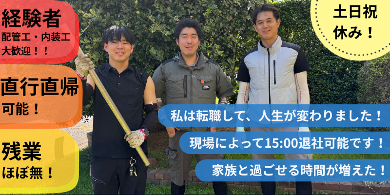 <直行直帰OKのため、居住地不問> ●未経験者・積極採用中!(30万円〜高待遇) ・応募条件/35歳以下 (長期勤続によるキャリア形成をはかるため/例外事由3号のイ) ●配管工事の経験者は優遇いたします。(35万円以上) ・年齢不問 ●性別は問いません ・協力会社では女性活躍中です。 ●個人事業主の方 ・インボイス制度等の影響で正社員勤務をお考えの方も ぜひご応募ください。