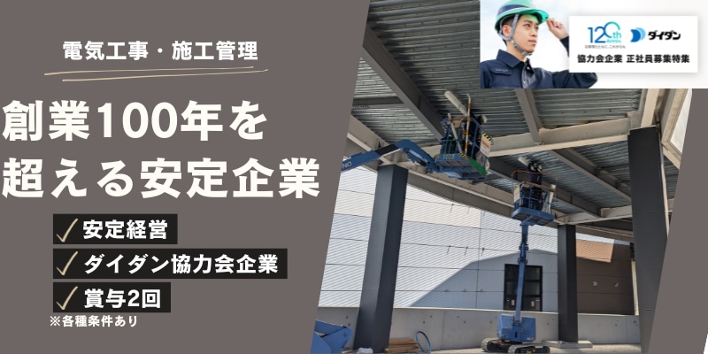 ◎100周年に向け施工管理/電気工事士を募集中!たのしい雰囲気が自慢/賞与3回/過去実績150万円!