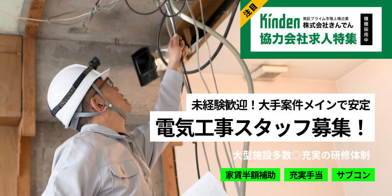 □□□□□【注目POINT】□□□□□ ◎ 賞与年2回+決算賞与で高収入も目指せる ◎ 退職金最大1000万円!将来も安心 ◎ 借り上げ社宅・家賃補助で新生活も応援 ◎ 若手専用カリキュラムでしっかり育成 ◎ 大手企業現場で活躍できる研修あり ◎ 風通し抜群!現場の声を大切にする社風 ◎ 離職率低め!長く働ける安心の職場 □□□□□□□□□□□□□□□□□ 近栄電設有限会社は、愛知県を中心に大手企業「きんでん」からの依頼を受け、 さまざまな建築物の電気工事を手がけている会社です。 ②募集職種の紹介 現在、当社では新築現場を中心とした《電気工事士》を募集しています。 未経験の方も経験者の方も大歓迎。施工管理へのキャリアアップを目指す方も積極的にご応募ください。 ======《仕事内容》===== 新築建設現場での電気工事全般を担当していただきます。 ・業務内容/施工内容 主に新築現場での電気配線工事、ケーブル敷設、照明・コンセントの設置、 引き込み工事など、電気工事全般をお任せします。加えて、既存建物のメンテナンスや改修工事にも対応しています。 ・主な施工現場 野球場、ビル、大学、工場、商業施設、物流倉庫、駅直結の高層ビルなど、 誰もが知る有名建築物の現場が中心です。 ・工期/施工期間 1件あたり1年〜1年半と、長期にわたる現場が多いのが特徴です。 ・現場件数 長期現場が中心のため、1現場にじっくり腰を据えて取り組めます。 ・チーム/作業人数 現場ごとに2〜3名のチームで作業を進めます。困ったことがあればすぐに相談できる環境です。 ・主な施工実績 駅直結の高層ビルや、地域のランドマークとなる野球場・大学・商業施設など、家族や友人にも誇れる実績多数。 ======《入社後の流れ》===== 入社後は、先輩スタッフと現場に同行しながらOJTで基礎から丁寧に指導します。 未経験の方も安心してスタートでき、資格取得支援や「きんでん」主催の講習会など、 スキルアップの機会も豊富です。現場の意見が経営にしっかり反映される、 風通しの良い職場環境も魅力です。 未経験者・経験者、共にプロを目指せる環境です。 電気工事士としてキャリアを築きたいあなたを、当社は全力でサポートします。 未経験の方には安心の育成プログラムを、経験者の方にはさらなる成長の機会をご用意しています。 充実の育成プランで、一人前の職長へ。 入社後のキャリアパスを明確に描けるのが当社の強みです。 =====《キャリアパス実例》===== 1年目:安全の基礎固め 入社後は、まず現場の安全作業ルールや手順を徹底的に学びます。 経験豊富な先輩の指導のもと、実際の現場作業にも参加し、安全な仕事の進め方を肌で感じてください。 2年目:チームの一員として現場へ。 基本的な電気図面が理解できれば、作業班の一員として現場作業に参加。 先輩とコミュニケーションを取りながら、実践的なスキルを習得していきます。 3年目:リーダーへの第一歩。 現場の進め方(工程管理・安全管理)が理解できたら、小規模現場の職長として現場を任せま す。小さな成功体験を積み重ね、リーダーとしての自信を育んでください。 4・5年目:ベテランとして活躍。総合的な工程管理・安全管理・施工管理能力を身につけ、 小・中・大規模現場の職長として、プロジェクトを牽引していただきます。 電気工事士経験者の皆さんへ 「今の会社では、これ以上の成長が見込めない」「もっと大きな仕事に挑戦したい」 そんな思いを抱えていませんか? 電気工事士経験者の皆さんへ 「もっと大きな現場で力を試したい」「マネジメントにも挑戦したい」 当社は、あなたの経験とスキルを正当に評価し、即戦力としてお迎えします。 経験や能力に応じて、入社直後から大規模現場の職長として、プロジェクトを牽引することも可能です。 あなたの経験を、当社の未来を創る力として活かしてください。