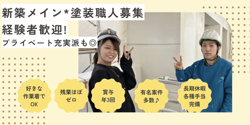 6年連続賞与3回!!新築メイン塗装職人募集◆安定の月給制+移動時間も残業手当支給!!経験者大歓迎♪