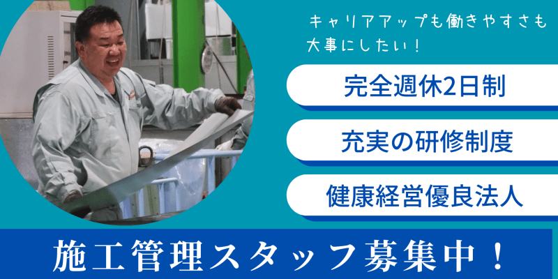 ───【注目ポイント】─── ******************************* ★未経験者歓迎! ★年間休日110日&完全週休2日制! ★賞与は年2回! ★残業少なめ! ★大手の案件多数! ★充実の研修体制&福利厚生! ★健康経営優良法人認定企業! ★74年の歴史ある、関西随一のダクト企業! ******************************* 私たちは空調ダクトの製造施工を専門としており、74年の歴史がございます。 おかげさまで、関西のダクト業界では知らない方がいないと評価頂いており、 多くの大手案件を手掛けて、信頼と実績を築いてきました。 今回は事業拡大に伴い、新たに"施工管理のスタッフ"を募集することになりました。 未経験者も大歓迎!基礎から丁寧に指導する充実の研修体制が整っていますので、 安心してスタートできます。 当社は健康経営優良法人として、社員の健康を大切にし、福利厚生も充実しています。 リゾート施設の格安利用や甲子園の年間シートなど、 社員のリフレッシュをサポートする制度も充実しています。 ご興味をお持ちの方のご応募を、ぜひお待ちしています! =======◇具体的な業務例◇======= ■得意先への営業 得意先の会社や現場事務所への訪問、得意先の各種イベントへ参加し、 得意先企業との関係構築をします。 ■見積作成 社内で図面を確認し、数量及び金額を積算します。 ■受注交渉 積算業務で作成した見積を基に、受注金額の交渉をします。 ■現場施工管理 担当する現場の進捗状況(工程や人員配置等)を確認します。(1現場につき週1回程度) また、現場ごとの予算管理や出来高確認、協力業者への支払い発注もします。 全てOJT教育により手取り足取りお教えしますので、ご安心下さい! 【教育体制について】 =======◇入社後の流れ◇======= 入社後は以下の流れで研修を行い、業務を覚えていただきます。 施工管理未経験でも、全く心配ございません! ■入社直後〜1ヶ月 製造部でダクト研修を行います。 目標:ダクト製作の仕組みを理解する ■1ヶ月〜2ヶ月 工事部で社内研修を行います。 目標:積算や安全書類等の社内業務内容を理解する ■2ヶ月〜 工事部でOJT教育を行います。 目標:現場管理等の社外業務内容を理解する