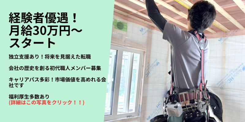=============《注目POINT》============= ◎経験・スキルを正当に評価!経験者は月給30万円〜 ◎将来を見据えたキャリア形成を支援(施工管理/独立) ◎家族も嬉しい住宅社割や多彩な福利厚生、退職金制度あり ◎インボイス制度に悩む一人親方・個人事業主も歓迎 ◎会社の次代を担う中核メンバーとしての活躍を期待 ◎石川へのU・Iターン歓迎!住まい探し等を手厚くサポート ======================================= ~あなたの経験が、会社の新しい歴史を創る~ セイダイホールディングスは6事業・86名の社員が在籍し、石川の地で堅実な成長を続けてる安定企業です。 今回は事業の核となる”株式会社セイダイ”にて、【戸建住宅/分譲住宅】の品質をさらに高める建築職人を募集します。 ■会社の未来を担う、初代・社員職人を募集します。 これまで外部に委託していた施工を内製化し、技術力を高めるための重要な募集です。あなたには、その歴史を創る【初代・社員職人】として、中核を担っていただくことを期待しています。 あなたの経験や実力に見合ったキャリアプランをご用意しています。 スペシャリストへの道 現場のプロとして技術を極め、後進の育成にも携わっていただきます。あなたの技術が、当社の品質基準となります。 独立への道 将来の独立も応援します。経営ノウハウや案件連携など、グループの総合力であなたの夢をバックアップします。 ご自身の未来を、ぜひ当社で描いてください。 興味を持っていただけた方には、面談の場でさらに詳しくご説明させていただきます。 □□□□□□□□□【仕事内容】□□□□□□□□□ ●新築住宅、リフォームの現場にて、あなたの技術を活かし、高品質な家づくりに携わっていただきます。 ●『大工』『左官』『タイル』『クロス』いずれかのご経験者を歓迎します。 《手掛ける物件》 お客様の夢を形にする、こだわりの住まいです。 □注文住宅 □企画住宅(デザイン性とコストを両立した自由設計の住宅) □分譲住宅 □リフォーム **/////////////【私たちの想いと、あなたへの期待】///////////// ** ◆会社の歴史を創る「初代・社員職人」としての採用です。 これまでのご経験を活かした「もっとこうすべきだ」という意見やアイデアが、そのまま当社のスタンダードになります。 ◆経験豊富な方には、即戦力として現場のコアメンバーをお任せします。 もちろん、未経験から挑戦したい方も歓迎します。協力会社のベテラン職人が丁寧に指導する体制を整えていますのでご安心ください。 ◆専門性を軸に、市場価値の高い職人へ。 あなたの専門性を尊重した上で、将来的には関連分野の技術も習得可能です。これは、あなた自身の市場価値を飛躍的に高め、生涯にわたって活躍できる職人へと成長できることを意味します。