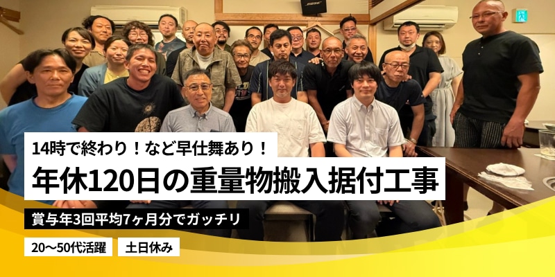 20代入社4ヶ月で月給40万円可能◆年3回賞与(7ヶ月分)/重量物の搬入据付工事スタッフ
