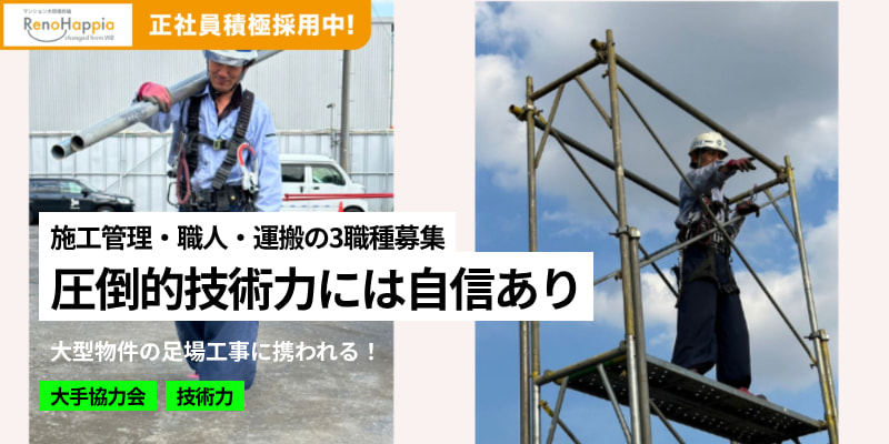 ========【注目ポイント】======== ◎鳶職・現場管理・ドライバーを同時募集中! ◎社員寮あり!ウィークリーマンション利用OK ◎昇給・賞与あり!頑張りをきちんと評価する制度あり ◎現場管理は週休2日・職人は残業なし! ◎資格取得支援制度あり!キャリアアップも積極応援 ======================== 株式会社蒼和は、関東一円で足場の仮設工事を手がけ、年間70万㎡以上の施工実績を誇る安定企業です。 資材センターに35万㎡超の仮設資材を保有し、自社便による迅速な配送体制を完備。品質・安全へのこだわりから、多くの顧客に信頼されています。 現在、以下3職種を積極採用中。いずれも経験者は優遇します。 ■鳶職(足場工) ・枠組足場、次世代足場、ビケ足場の組立・解体作業 ・主に大規模修繕工事での足場仮設を担当 ・作業はチーム制で進行し、安全第一の現場環境 ■現場管理 ・現場調査、見積作成、発注業務 ・鳶職への指示出し、スケジュール調整、品質管理など ・社用車・スマホ・PC貸与あり、経験を活かして一現場をリード ■ドライバー(資材運搬) ・ユニック車を使用し、足場資材の配送・回収を担当 ・主に所沢拠点から関東一円の現場へ対応 ・運転時間は残業として反映、労働時間管理も徹底 ■フォークリフト(資材運搬) ・現場作業の円滑な進行を支える重要なポジション ・足場材を効率的かつ安全に運搬・管理 ・作業全体のスムーズな流れを実現