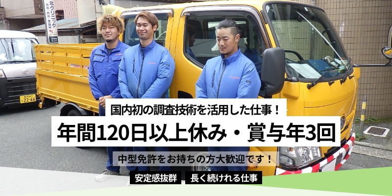 【国内初!横浜市と共同開発した調査技術】 ●ノズルカメラによる下水道管スクリーニング調査の導入は 自治体では横浜市が全国初! 【残業はほぼゼロ!】 ●16時〜17時には事務所に戻り、書類作成/翌日の準備等を 行い、17時は退社することがほとんどです。 ※現場が近隣メインのため、移動時間も少ないのが特徴です。 ※交通状況により遅くなる場合があっても17時半には退社できて います。 【年間休日120日以上/完全週休2日】 ●当番制による緊急対応での出勤の可能性もありますが、 実情はほとんどなく年3回程度。 ライフワークバランスを重視できる働き方が可能です。