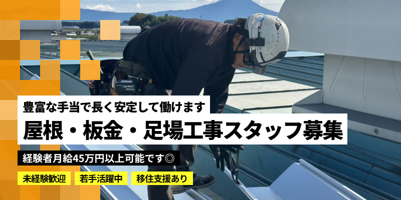 【建設業の経験者!】 ◎屋根・板金工事は未経験でも建設業での 職人経験があればご応募歓迎します。 ◎足場職人の方に入社いただければ最高です! ◎溶接、鳶、塗装、防水、太陽光パネルの設置 など経験者も大歓迎です。 【資格】 ◆要普通自動車免許(AT限定でも可) ◆あれば歓迎/活かせる資格 ∟ 玉掛け ∟ アーク溶接 ∟ 足場組立作業主任者 ∟ 小型移動式クレーン ∟ 高所作業車 ※その他、建築業の資格 【こんな方も歓迎】 ■アウトドア好き、キャンプ好き! (キャンピングカーの無償貸し出し) ■移住、Uターンを希望される方! ■これまでの経験を活かして、 新しいスキル、経験を積みたい方!