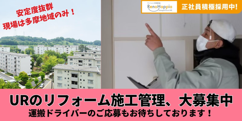 ================《注目POINT》================ ◆テレビCMでお馴染みのUR団地での施工管理スタッフ募集 ◆半数以上が女性社員!時短勤務・休日など柔軟に対応 ◆運搬ドライバーも同時募集中(普通免許のみ必須) ◆現場は多摩エリアのみ/拠点より約40分圏内 ◆週休2日!曜日は自由に選択可能 ◆未経験でもコミュニケーション能力を評価し優遇! =========================================== 株式会社日野工務店の採用情報に目を留めていただき、 ありがとうございます。 当社は多摩エリアの11棟のUR団地の各種施工の管理を 行っている会社です。 ◇女性多数活躍!施工管理&運搬ドライバーを募集。 ・完全未経験からご応募OK! ・施工管理の半数は女性社員/性別不問で採用いたします。 原状回復〜フルリノベーションまで、モノづくりの魅力も 感じてもらえる仕事です。 お一人でも多くの方に興味を持っていただき、ご応募して もらえることを期待しています。 □□□□□□□□□□□⦅仕事内容⦆□□□□□□□□□□□ ▼『URであーる』のCMでお馴染みのUR団地での 原状回復工事、在宅中の修繕工事、IKEA/無印良品・大学コンペ などの企画モノのフルリノベーションの施工管理をご担当して いただきます。 ▼主な管理業務 ・現場調査 ・元請との打ち合わせ ・協力会社の手配(大工、クロス、電気、設備、美装など) ・資材の手配 ・安全、品質、工程管理 ・写真撮影、写真整理 ・報告書類の作成 ◎管理ツールには「ANDPAD」を導入しスムーズな 管理を行えます。 ◎管理は複数の現場を並行して管理していただきます。 ◎原状回復工事は居住年数により作業内容、作業期間は 異なります。 ※10年以上で1ヶ月、10年未満で3週間程度、 1年〜3年で12日程度となります。 ◎IKEA/無印良品・大学コンペなどの企画モノの フルリノベーションではモノづくりのやりがいも感じていただけ ます。 ////////////////////////////// 【運搬ドライバーも同時募集】 ////////////////////////////// ・1トン車/750kgトラックのいずれかを運転し、 現場での撤去作業、産廃の運搬・処理センターへの運搬 などをご担当していただきます。 ・経験の有無は問いません!普通自動車免許(AT)を お持ちであればどなたでもご応募可能です。