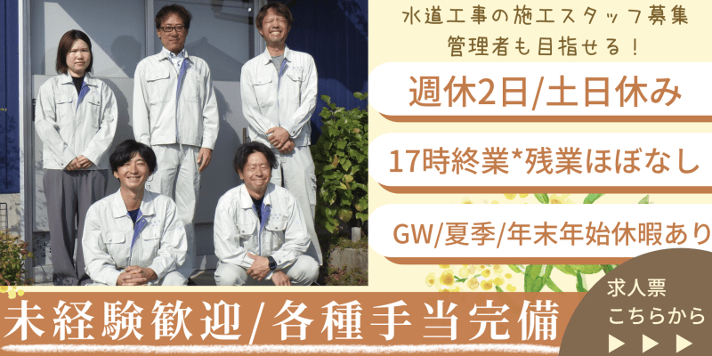 =======《注目POINT》========= \公共メイン*元請けのため工程にゆとり◎有給取得も取りやすい/ ◎賞与2回/昇給1回◆頑張りを還元していきます!! ◎土日休/GW/夏季/年末年始も完備♪ ◎地域密着!!豊明市がメインで残業月10時間以下に ◎未経験歓迎*職人から施工管理を目指している方への支援制度も ◎UJIターン歓迎♪交通費補助等の支援も!!※応相談 ======================= 「安定した環境で私生活も大切にしながら、生活に欠かせない“水道の技術”を身につける。」そんな未来を描ける… 公共工事から家庭の水回りまで幅広く手掛ける“水道のプロ集団”。 未経験からでも着実に技術を学び、国家資格の取得も会社が全力でサポートします。 安定した仕事量、残業の少なさ、仲間との温かい職場環境。 安心して働き続けられる基盤を築けるからこそ、長く活躍できるのが魅力です。 私たちはあなたの挑戦を全力で応援いたします。 「話を聞くだけ」でも構いません。まずはお気軽にご相談ください。 ■仕事内容 ライフラインに欠かせない「水道工事」 メインは役所から依頼を受けた公共工事で水道管の入れ替えや配管工事など。 また、一般家庭や店舗の水回り(蛇口の水漏れ・トイレの詰まり修理など)にも対応します。 経験や資格は問いません 最初は先輩と一緒に作業しながら、工具の名前や作業の流れを覚えるところからスタート。 資格取得や講習費用は会社が全額負担するので、働きながら国家資格も狙えます。 重労働のイメージがあるかもしれませんが、実際は機械化が進んでいるので体への負担は少なめ。 技術を磨けば、未経験からでも「水道のスペシャリスト」として長く活躍できる環境です。