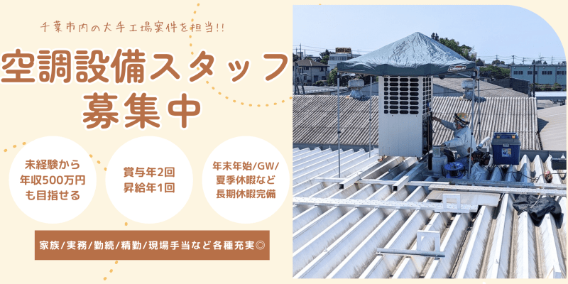 ========【注目ポイント】======== ◎JFE構内を中心とした千葉市内の安定案件が多数 ◎未経験から年収500万円も目指せる!手厚い教育体制あり ◎有資格者は即戦力として年収700万円超も可能 ◎無理な工期なし&夜勤・徹夜なし!生活リズムを崩さず働ける ◎現場は2名以上で対応、フォロー体制も万全 ======================== 千葉設備工業株式会社は、千葉市中央区に拠点を構え、主にJFEスチール構内の空調設備工事・保守業務を請け負っている会社です。 創業から58年の歴史を持ち、長年にわたる信頼関係のもと安定した受注を続けています。 今回の募集では、未経験から一生モノのスキルを身につけたい方、または空調工事や配管工事、電気工事の経験を活かしたい方のどちらも歓迎します! 【具体的な仕事内容】 ■工場内の空調設備に関する施工・補修・点検業務 ■作業内容はエアコンやダクト、配管の設置・交換・メンテナンスなど ※1人での作業はなく、必ず2名以上のチームで対応します。 ▌案件の特徴 ・担当するのはほぼすべて法人案件(一般家庭は対応なし) ・案件の7割がJFE構内、そのほか千葉市内の大手工場が中心 ・一般的な建設現場と違い、空調の効いた屋内作業が多く、夏場も比較的快適 ・徹夜作業・泊まり込み・夜勤なし ▌業務の流れ(例) 8:30 朝礼&ミーティング・チームで現場へ移動 9:00 作業開始(点検や設置工事) 10:00 小休憩(15分) 12:00 昼休憩(45分) 15:00 小休憩(15分) 16:30 作業終了・帰社 ※新人のうちはほぼ定時退社も可能です ※もっと仕事がしたい!という方は現場状況により18:00〜19:00頃まで 書類整理等で残業する日もあります。 【未経験者の方へ】 ■入社後はOJT形式で、先輩と一緒に現場を回りながら仕事を覚えます ■道具の使い方から丁寧に教えるので、未経験でも安心 ■1年後にはメーカー講習の受講や、資格取得支援制度を活用してスキルアップが可能です 【経験者の方へ】 ■空調設備の施工・保守経験をお持ちの方は即戦力として歓迎 ■施工計画の立案や、協力会社との折衝、日報の作成など、管理業務にも関われます ■管工事施工管理技士や電気工事士などの資格保有者は優遇