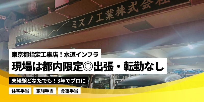 ========【注目ポイント】======== ◎創業65年の老舗企業で、都内中心の安定案件多数 ◎給水・排水・修繕工事など幅広い経験が積める現場 ◎夜間工事にも手当あり!頑張りがしっかり収入に反映 ◎社員同士の関係性◎釣り・BBQ・ゲームなど交流あり ◎日払い・手当支給あり!生活サポートも充実 ======================== 創業60年以上! 東京都大田区に本社を構えるミズノ工業株式会社では、 都内の住宅や道路の水道工事を手がけています。 今回は、正社員として衛生配管・水道工事に携わる仲間を募集! 現場は東京都23区を中心とした都内限定で出張・転勤も基本ありません。 経験者はもちろん、未経験の方も「真面目に取り組む気持ち」があれば大歓迎! 長く働ける環境と、しっかり技術が身につく体制を整えてお待ちしています。 【具体的な仕事内容】 ■新築集合住宅・戸建住宅の給水・排水配管工事 ■道路から建物へ水道を引き込む取り出し工事 ■古い配管の撤去・更新作業 ■住宅内での修繕・漏水対応 ■水道局からの受託業務 【現場の特徴】 ■案件の多くはデベロッパーや工務店からの直接受注 ■水道の本管工事ではなく、戸建てや集合住宅の宅内配管が中心 ■現場は都内中心で、遠方への移動はなし ■チームでの作業が基本(個人での派遣ではありません) ■年間10〜20回ほど夜間工事あり(希望考慮、手当あり) 配管工事は道路の掘削からスタートし、バルブやメーター周辺の施工、建物内部の衛生設備まで多岐に渡ります。下水・外構・舗装まで幅広く対応するため、他社では経験できない業務に関われます。新設・更新・改修のいずれにも関わり、東京都内の水まわりインフラを支える手応えを得られます。案件は新築と改修の双方にまたがり、作業結果が目に見える達成感が魅力です。 【入社後の流れ(未経験者)】 入社後のキャリアを明確に描けるのが当社の強みです。 まず数日間は、現場の見学+軽作業(ほうきでの清掃、等)で流れを観察していただきます。 ■1年目~:基礎習得と現場デビュー 入社後、工具・安全ルールを徹底習得。現場配属後はOJTと必要資格の取得で基礎を確立します。 ■2年目〜:技術深化と資格取得 複数の現場経験で専門技術を磨き、建設機械運転免許など、キャリアアップに必須の資格取得を支援します。 ■3年目〜:1人前の「職人」へ 予算・工程・労務管理を学び、現場を牽引。 「給水装置工事主任技術者」等習得のため試験に挑戦し、会社の中心として活躍していただきます。 掘削、配管、仕上げ、舗装まで一連の工程を担当できるようサポートします。 「真面目に取り組む気持ち」が大切★ 将来的には現場の責任者としてご活躍していただいと思っております。 技術レベルに応じて昇給制度を整備中。「どこまでできれば月収いくら」という目安を今後設定予定です。 【こんな人が活躍中】 現在、社員は13名。20代〜60代まで幅広い年代が在籍しており、10年以上勤務しているベテランが多数在籍。 未経験から3年で職人として活躍する社員もおり、社長自ら丁寧に育てる風土が魅力な会社です!