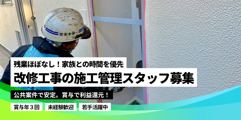 ▷必須は車の免許のみ・改修工事の施工管理!現場はマンション/公共施設!残業少・休暇取得しやすい会社◎