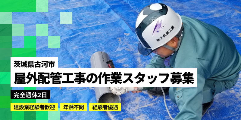 ◆建設業経験者からのご応募歓迎いたします。 \応募はじめの段階で、書類のご用意は不要/ まず、電話応募・web応募で 簡単な経歴をお伝えください。 次に、面接の時に、 ①履歴書 ②身分証明書 をご用意のうえお越しください。 ◆建設業経験者の方の経験で、 配管工事(給排水衛生設備工事)や 土木工事(土工事、重機オペ)の 経験者は優遇いたします。 □□□□□□□⦅注目POINT⦆□□□□□□□ ◎あらゆる新築現場で活躍・屋外配管工事! ◎現場は関東一円・旅行気分も味わえます ◎移動時間も勤務時間にカウント・残業代も支給します ◎上場企業などの大手から地元企業まで取引先多数 ◎移住・Uターン大歓迎/支援・サポートあり □□□□□□□□□□□□□□□□□□□□□ 茨城県古河市に拠点を構え、『屋外配管工事』を 行っております株式会社大久保工業と申します。 大手サブコンをはじめ取引先は多岐に渡るため、 安定して働くことができます。 茨城県への移住・Uターンも大歓迎です。 可能な範囲での支援、サポートも行いますので お気軽にご相談ください。 ////【あらゆる建物が現場!】//// ◆あらゆる建物で必要不可欠な『屋外配管工事』の 現場作業をご担当していただきます。 《仕事の流れ》 ※土木工事にあたる業務内容について ▼建物の外部で『バックホー』を使用し 掘削作業を行います。 ▼穴の高さの測定、 スコップによる手元作業での掘削を 行います。 ※配管工事にあたる業務内容について ▼建物内にある『給排水、排水、消火栓』と 公共下水をつなぐ配管作業を行います。 ▼配管作業が終われば、埋め戻し、土を慣らし、 最終的に低圧のローラーで舗装を行い 終了となります。 -------------------- 《主な作業現場》 -------------------- ◎病院・学校・大型商業施設 工場・倉庫・研究所など あらゆる建物が私たちの施工現場です。 ◎携わる現場の80%〜90%が新築現場です! ▶︎まずは現場の職長が技術の指導を行います。 手元作業から仕事を覚え、ゆくゆくは重機の操作にも チャレンジしていただきます。 ▶︎現場は3名1組で作業を行うことが多いです。 ※現場によっては増員するケースもあります。 ▶︎毎日現場が変わる場合もあれば、 まとまった日数で作業を行う場合もあります。 新築現場の場合、 足掛け3年〜5年のようなケースも。 ▶︎現場は関東一円、幅広く対応するので、 旅行気分が味わえるのも魅力! ▶︎移動距離が長い場合、 残業代としてカウントし 全額を支給いたします。