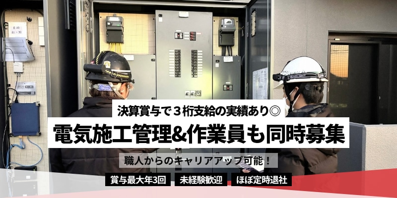 =====【注目ポイント】==== ☑未経験から施工管理を目指せる育成体制あり ☑賞与年2回(6月・12月)+業績により決算賞与 ☑月の残業は平均10時間未満、定時退社が多い職場 ☑早出の現場出勤も残業代としてしっかりカウント ☑新築RC造マンションの電気工事一式 ☑現場スタッフも同時募集 ☑普通自動車免許(AT可)をお持ちであれば応募可能 ☑都内23区中心+一部川崎/練馬近隣の埼玉方面からも通勤圏 株式会社進和電気は、新築RC造マンションの 電気工事一式を手がける会社です。 案件増加にともない、人手不足の解消と 社内の若返りを見据えて、新たな仲間を募集します。 特に、将来施工管理として活躍できる方を 採用・育成していきたいと考えています。 電気工事の経験がない方も、先輩について学べる環境があります。 =======【仕事内容】======= 《こんな現場です!》 ■担当する工事 新築RC造マンションの電気工事一式 ■案件 民間のみ(公共工事はありません) ■工期目安 半年〜1年ほど ■現場のエリア 都内23区が中心/一部川崎エリア ■出張の有無 なし ■勤務の流れ(現場に行く日:週2回程度) ・8:30 出社 ・9:00〜9:30頃 会社を出発 ・11:00 現場到着(作業は行わず、状況確認が中心です) ・12:00 休憩 ・13:00 現場確認(職人さんと会話して現場の状況把握) ・14:00 現場を出発 ・15:00 帰社後、図面修正や手配などの社内業務 ・18:00 退社 ■勤務の流れ(社内業務の日) ・8:30 出社 ・8:30 CAD作業、図面修正、手配業務などが中心 ・12:00 休憩 ・13:00 CAD作業、図面修正、手配業務などが中心 ・18:00 退社 ※現場都合で早出が発生する場合もありますが、 その分の時間は残業としてカウントします。 【現場スタッフ/作業員について】 現場スタッフも募集しています。 ・入社後は、先輩や協力会社の職人につき、実務を通じて仕事を覚えていきます。 ・将来は独立し、協力会社として取引する働き方も視野に入れています。