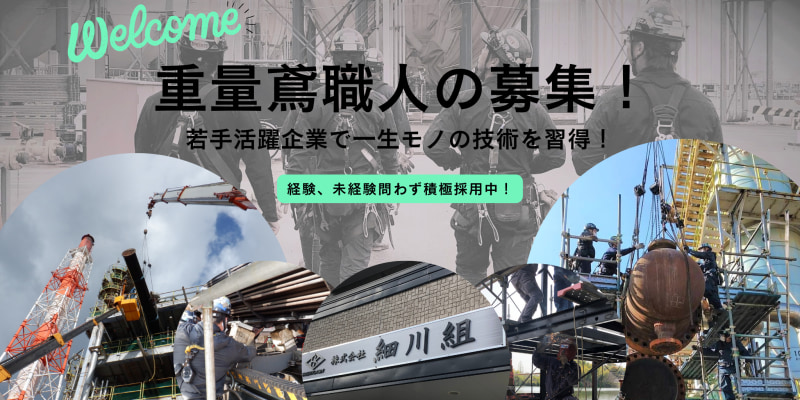 <POINT> ・重量物だけでなく、足場や工具作業など幅広く覚えられる! ・頑張りや成長を見てもらえて、収入アップを目指せる! ・つかず離れずの距離感で、仕事は仕事として集中しやすい! <社員インタビュー①> 私は社内で経験年数が上の方なので、 若いスタッフに教育、指導をする役割になります。 自分と一緒の現場で作業したスタッフが成長し、 他の現場でも活躍している姿を見た時に とてもやりがいを感じています。 現場での作業では、その時々の状況、天候などが毎回異なり、 柔軟に対応していく事が必要になります。 作業内容は覚える事もあり、大変なことももちろんあります。 だからこそ、 仕事に飽きることなく、 自分の得意な所を伸ばす事が出来ます。 一緒に、一流の技術者を目指して頑張りましょう! <社員インタビュー②> 私は現場監督として、作業スタッフへの指示や お客様との打ち合わせ、作業工程の管理などを行っています。 現場監督のお仕事は責任の大きい役割ではありますが、 大変だからこそ仲間と上手く協力して無事に完工できた時には 大きな達成感を感じることが出来ます! 細川組のメンバーはみんな仲が良く、和気あいあいとした雰囲気です。 どんな仕事でもチームワークで乗り越えてきました。 大きなプロジェクトを達成した時の気持ち良さを、一緒に味わいましょう!