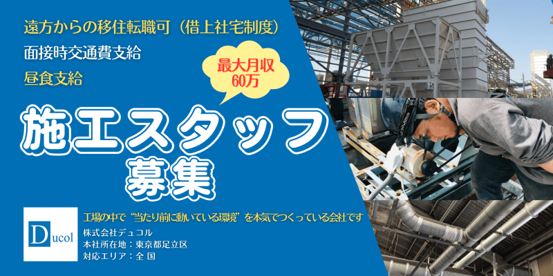 =====【注目ポイント】==== ◎月給30万円〜60万円! ◎賞与は年1回(6月)の決算賞与 (昨年最大実績:6ヶ月分) ◎住宅手当あり(家賃の80%を補助) →独身:最大3万円/既婚:最大5万円 ◎地方からの引っ越し転職の実績あり (兵庫・岡山・新潟など) ◎お菓子・お飲み物など無料 ◎昼食支給あり(お弁当) ◎営業での外出時は昼食代1,000円支給 ==================== 株式会社デュコルは、工場などの生産現場において粉塵や臭気を除去する 環境改善設備(集じん・脱臭設備)の施工・保守までを一貫して行っている会社です。 飛行機の機体を作る工場、車やバイクの研究所、 電車の車検場、コンビニ弁当の製造工場・・・ さまざまなモノづくりの現場が私たちのお客様です。 この度業績好調により、建設部門にて正社員を募集しています。 現在は建設部が2名体制で、 現場作業・営業・施工管理を兼任しています。 施工管理・営業が未経験でも、建設業の現場経験があればぜひご応募ください。 地方から引っ越ししてきた社員もおり、 全国からの応募も大歓迎です。 《仕事の内容》 ■担当職種 集じん・脱臭設備の施工スタッフ (一部、施工管理業務を含む) ■主な業務内容 集じん・脱臭設備の据付・メンテナンス 現場での安全管理、関係各所との連携・調整など ■勤務の流れ 現場により勤務開始時間が異なります。 ■出張について 1〜5泊の出張あり(月2、3回) ※その年によって変動あり ※出張手当、出張休日手当あり ■事務作業について 工事案書類・報告書の作成があります。 PCは基本操作ができれば問題ありません。