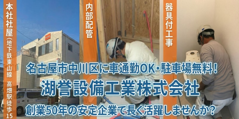 ====注目ポイント==== ☑︎ 未経験OK。3年で戦力化します。 ☑︎ 30代で年収600万円超の実例あり。 ☑︎ 有給消化率は約8割。 ☑︎ 残業は少なく、繁忙期でも月8時間未満。(2025年実績) ☑︎ 生活インフラを支える、なくならない仕事です。 ◆中川区にマイカー通勤OK バイク通勤OKで快適! 駐車場: 本社で駐車場を手配するため、 ご自身で月極駐車場を探す手間や 費用はかかりません! 交通費: 車通勤の場合も、 距離規定に応じて交通費を支給します。 ============== 生活に欠かせない マンション・アパート・住宅の 給排水設備工事を担当します。 現場は2人1組。 未経験者は「手元」からスタートします。 仕事量は安定。大手元請け案件が中心です。 3年ほどかけて、じっくり戦力化します。 湖誉設備工業株式会社は、 名古屋市を中心に 給排水設備工事を行う会社です。 水道は電気やガスと並ぶライフライン。 仕事がなくなることはありません。 現場はマンション(10〜14階規模)や アパート、住宅が中心。 元請けは長年取引のある大手企業で、 年間を通して仕事量は安定しています。 1日の流れ(目安) 7:15 朝礼 8:00 現場入場・作業開始 17:15 作業終了 現場は4チーム体制(2人1組)。 未経験の方は、先輩の「手元」として 作業を覚えるところから始めます。 屋外作業のため、 暑さ・寒さ、掘削など 体力を使う場面もあります。 楽な仕事ではありませんが、 その分、給与と休みでしっかり還元しています
