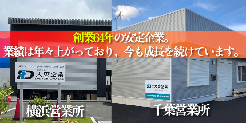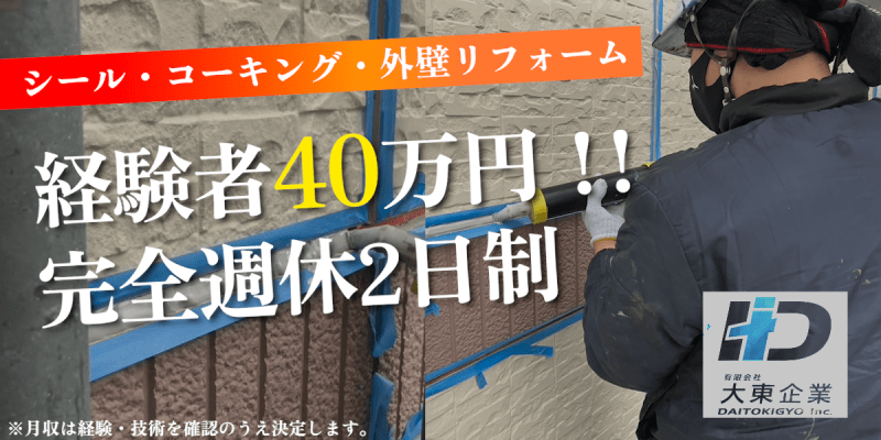 =====【注目ポイント】==== ☑未経験OK!先輩社員・職長が現場で丁寧にOJT ☑現場は県内中心(千葉県または神奈川県がメイン)で働きやすい ☑出張なし/転勤なしで生活リズムを崩しにくい ☑少人数(2〜3名)チームで動き、相談しやすい環境 ☑技術の上達が「できる長さ」など数字で見え、成長を実感できる ☑仕上がりがキレイになるほど達成感が増える仕事 ☑希望に合わせたキャリア形成が可能 ===================== 有限会社大東企業は住宅を中心とした外装リフォーム工事を手がける会社です。 千葉営業所・横浜営業所の2拠点で、事業拡大に伴う現場スタッフを募集します。 関東エリアは、住宅の外装リフォームが中心。 シーリング(コーキング)の打ち替えや、サイディング関連の工事がメインです。 現場は戸建が約7割、アパートが約3割。 仕事は大手ハウスメーカーから一次下請けとして請け負っており、 長期間で安定した仕事量を確保しています。 社員は千葉8名、横浜3名。 社員に加えて協力会社様とも連携しながら、現場対応を行っています。 ■担当する工事 ・外装リフォームにおける防水関連作業 ・シーリング(コーキング)の打ち替え/補修 ・サイディング関連の作業 ■現場エリア ・千葉営業所:千葉県内がメイン ・横浜営業所:神奈川県内がメイン ■チーム体制 ・2〜3名で現場に入ることが多いです ・現場によりメンバーは入れ替わります ■工期の目安 ・1週間以内〜1週間程度の現場が中心です ■教育・育成の流れ ・現場で先輩社員や職長が 丁寧に教えます ・3ヶ月で基本を習得し、 2年程度で一人前を目指します