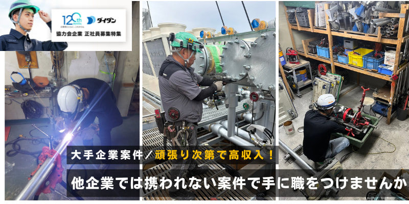■■■■■■■■<注目POINT>■■■■■■■■ ◇未経験者、積極採用中!配管工事スタッフ募集 ◇リニューアル工事がメイン ◇午前中、午後イチで仕事が終わる日も多々あります ◇現場では20代・30代・40代以上のベテランの9名が活躍 ◇和気あいあいとした雰囲気! ◇ものづくりの達成感を味わえる仕事 ■■■■■■■■■■■■■■■■■■■■■■■■ ダイニン工業株式会社は『給排水衛生設備、空調設備』を 中心とした配管工事を行う会社です。 大手サブコンの協力会社として安定した業績を 続けており、社員募集することになりました。 《未経験者、積極採用中!》 ◎普通自動車免許のみ必須で、未経験から採用いたします。 定時前に仕事が終わることも珍しくありません! 資格取得など有意義に時間を使い、充実した生活を 送っていただけます。 たくさんのエントリーをお待ちしております。 ===============⦅仕事内容⦆=============== 給排水衛生設備、空調設備等の配管工事を行っております。 リニューアル工事がメインとなります。(新築の現場も 一部、対応しています) ◇主な施工現場 ・大型商業施設 ・ビル ・公共施設(学校など) ◇現場作業について ・作業人数は平均2〜3名1チームで対応いたします。 ・小工事の場合には単独での作業で1日で完結する場合も あります。 ・規模によっては5〜7名程度まで増員します。 ・工期は1年以内までとなります。 ◇未経験の方 ・未経験の方は、手元作業などのサポート業務から 現場に慣れていただきます。 ・必要な資格はすべて会社バックアップの元で取得して いただきます。 /////////// 【POINT】 /////////// ●早ければ定時前には作業が終了する場合があります。 ●現場上によっては夜間作業、休日出勤になる場合が あります。 ●未経験の方でも資格取得し、将来的には職長への キャリアアップを目指してほしいと思います、 ●ご自宅と現場が近い場合、または会社に向かう方向と 逆の方向の現場であれば、直行直帰も認めております。