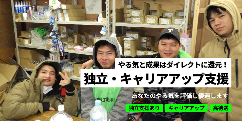 <この会社で働くときのスタイルは?> ・現場に直行直帰が基本です。 会社に頻繁に戻る必要がないので、 現場に集中して働けます! <社内の付き合いはどんな雰囲気?> ・飲み会が多い会社ではありません。 仕事は現場でしっかり連携しつつ、 業務外はほどよい距離感だと思います! <未経験でも大丈夫ですか?> ・先輩がサポートしながら教えます。 1人立ちの目安は1〜2年ですが、 本人次第で成長できる環境です! <将来のキャリアはどう考えられますか?> ・経験を積んで独立を目指すこともできます。 やる気がある方には、 できることを増やせるように任せていく考え方です! ・独立を目指す方を全力応援! 現場でしっかり経験を積んだ先には、独立という道もあります。 独立支援も行っているので、自分の力を試したいという 野心のある方は大歓迎です! ・「現場のスペシャリスト」から「経営の右腕」へ 職長として現場をまとめたり、 管理業務や後輩の育成に回ったりと、 ステップアップの道も用意しています。 将来的には、社長の右腕となって 組織を支えてくれるような存在を 目指してほしいと考えています! <どんな人が評価されますか?> やる気と成果はダイレクトに還元! 「仕事ができる人」「意欲がある人」を 埋もれさせることはありません。 頑張りは給与や役職でしっかり優遇します! ・「やりたい」にNOは言いません! 新しい技術の習得や、資格取得など、 やる気次第でどんどん仕事をお任せします。 現場の体制をより良くするための提案も大歓迎。 「指示待ち」ではなく、 自ら動ける人が一番輝ける環境です!