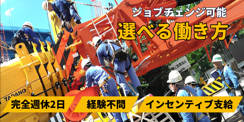 【安定した経営を続け60年目】 ■大成建設、鹿島建設、長谷工などの 大手企業との取引で常時70現場ほどは 稼働しており、景気や社会情勢に左右されず 安定して働けます。 【経験・性別は一切不問】 ■車の免許をお持ちであれば、どなたでも ご応募していただけます。 技術指導、資格取得支援は全面バックアップ いたします。 【ジョブチェンジ可能】 ■クレーンオペとして現場で活躍したのち、 施工管理(番頭)へのジョブチェンジする ことも可能です。 これまでの経験、クレーンの知識を活かして 管理業務へ転身することで長く働けます。 (再雇用制度あり)