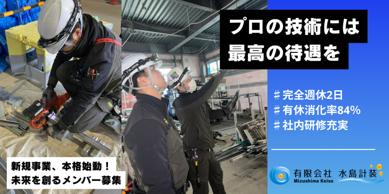 有限会社水島計装は1975年に創業した 計装・電気工事を行う会社です。 メーカー、サブコンなどの大手企業との 取引が中心となり業績は安定しております。 ///////////////【P O I N T】/////////////// …………………………………………………… 【1】完全週休2日制度導入! ・祝日も休日へ変更しました ・年間休日125日以上 ・1人当たり実労働時間 130時間/月 ・有給取得率は84%! ※2024/8~2025/7の実績 …………………………………………………… 【2】頑張りはお給料へ還元します ・特別手当:30〜150万円×2〜3回 2024〜2025年:特別手当支給 ・昇給実績 2024年度:全社員が昇給(物価高騰を受け) 2025年度:全社員が昇給 …………………………………………………… 【3】新事業本格始動! 自社検証施設あり 「スマートビルディングEXPO」 出展を経てSI事業が加速! 社内に検証 実証施設を新設! 現場前にプログラム試験が可能 「工事×IT」 の最先端スキルを磨ける環境です …………………………………………………… ┌───────[ 仕事内容]───────┐ ▶︎作業内容 計測制御機器の取り付け、 付随する配線・配管工事 制御システムのプログラミング 構築 (SI業務) 自社内施設でのシステム検証・シミュレーション ▶︎現場は新築現場が中心 病院、教育施設(学校)研究所 物流センター、オフィスビル、ホテルなど ▶︎平均施工期間:1年〜1年半 ※躯体の初期段階〜完成まで 現場の進捗に合わせて動きます。 ▶︎4名1班で作業を行います ・施工管理(職長)が施工図面などを確認し 仕切りながら、実作業も行います。 ・未経験の方は OJTにて作業を覚えていただきます。 └──────────────────┘