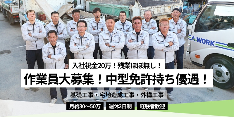 ▼▽▼おすすめポイント▼▽▼ ☆エーワークで働く上での魅力4選☆ ◎ 『若手が幹部を目指せる環境』 創業75年の老舗企業ながら、2023年に社名変更し再スタート! 現場作業から施工管理、営業まで多彩なキャリアパスがあり、 意欲ある若手が将来の幹部候補として主役になれる環境です。 ◎ 『高水準の給与・従業員への還元』 平均月給:30〜50万円(入社祝金20万円あり) 管理職の年収:〜700万円可能 ボーナス支給:年2回+決算賞与(実績あり) 2年連続で基本給5%UPなど、利益はしっかり社員に還元しています。 ◎ 『会社の将来性と安定性』 創業75年で培ったゼネコン・公共工事等の強固なネットワークがあります。 自社で機械・車両・土場を保有する機動力があり、安定した経営基盤が自慢です! ◎ 『ワークライフバランス&抜群の立地』 残業は月10時間以下!休日出勤時は振替休日取得も可能! 会社から徒歩5分の場所に【寮完備】通勤ストレスもゼロ! ▼▽▼こんな方は特におすすめ▼▽▼ ・4tダンプに乗れる方 ・中型免許をお持ちの方 ・ブロックを積める方 ・アスファルト舗装ができる方 上記の1つでも当てはまる方、絶好のチャンスです! はじめまして、有限会社エーワークと申します。 当社、採用ページをご覧いただき、感謝申し上げます。 我々は名古屋市南区を拠点にした建設・土木の施工会社です。 1947年創業の弊社ですが、2023年8月4日に社名を変更、更なる事業拡大に向けて再スタートを致しました。 成長を目指すからこそチャンスも多数ございます。 ご自身の実力を存分に発揮しながら、企業と共に成長しませんか? ▶︎機動力(機械、車両、土場を自社保有) ▶︎技術力(長年培った技術) ▶︎実績(75年の実績) 3つの強みを生かして、公共工事、民間工事、さまざまな現場で事業を展開しております。 ==========/仕事内容/=========== 主に「基礎工事」「宅地造成工事」「外構工事」に携わっていただきます。 慣れるまでしっかりとフォローしますのでご安心ください!未経験からでもご活躍いただけます! 《現場内容例》 ■造成工事 ■外構工事/エクステリア ■駐車場工事 ■大規模な土木・基礎工事 【募集職種】 ・現場作業員(多能工) ※未経験/経験者、異業種からの転職歓迎! ※施工管理へのキャリアアップも歓迎! ※営業も募集しておりますので、挑戦してみたい方、または経験者も大歓迎! ⦅作業の流れ⦆ ▽1組4名(手元作業、配管工、重機オペなどで構成) ▽名古屋市南区豊田の事務所へ集合し、現場へ。 ▽現場は東海3県(愛知、岐阜、三重) ▽現場での作業内容は案件により異なりますので、 多能工として、広い技術を身につけることが可能です! ・施工管理(現場作業を兼務) ※未経験/経験者、異業種からの転職歓迎! ※施工管理へのキャリアアップも歓迎! ※営業も募集しておりますので、挑戦してみたい方、または経験者も大歓迎! ⦅施工管理の仕事内容⦆ ▽現場作業を兼務しながらの管理となります。 ・工程管理 ・安全管理 ・見積もり/予算管理など 現場作業が安全かつスムーズに進行するための 管理業務をお願いします!
