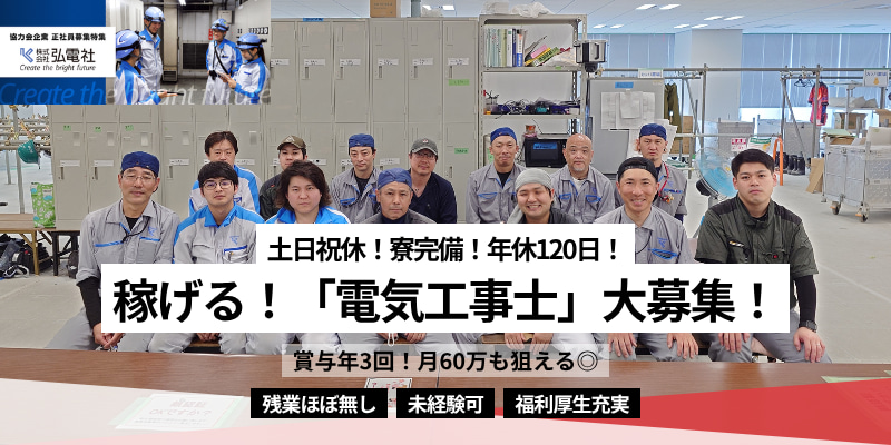 【土日祝休/寮完備!】年休120日以上!電気工事士募集/賞与年3回、年収1000万超えの実績有!