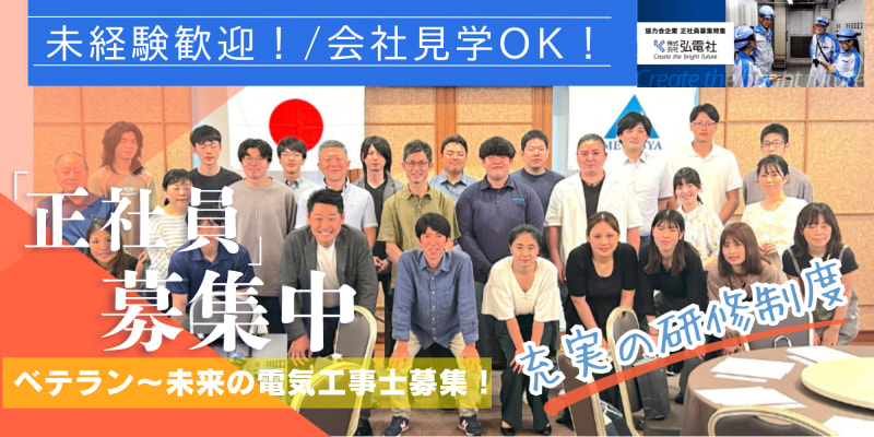 □□□□□□□【注目POINT】□□□□□□□ ◉経験者月収例:30~50万! ◇1年目/経験者/30代 月26万+手当4万=月収30万 ◇8年目/経験者/37歳 月40万+手当10万=月収50万 ◎健康づくり取り組み企業に認定/相談窓口あり ◎最大年4回の外部研修など各種教育制度が充実 ◎各種手当、各種祝い金制度(住宅購入など)、iDeCo加入補助など待遇面充実 ◎直行直帰OK&残業少なめで働きやすい! ◎大手企業・公共事業など抜群の安定性! ◎部署選択・異動可でキャリアの幅が広い ◎経験・性別・資格/免許不問(女性電気工事士活躍中) ◎住まいに関する福利厚生充実!住宅手当に加えて26年夏より社員寮も完備♪ ◎2027年4月から完全週休2日に移行予定* □□□□□□□□□□□□□□□□□□□□□ 「明るく輝く社会を創る」 株式会社明輝社は、幅広い分野で電気工事を行なっている会社です。 ◆5部署で正社員を募集中! *希望・適正に応じた部署でご活躍していただけます。 *入社後の部署移動もOK。 【助太刀から採用実績2名!】 社歴が近い方と一緒に現場へ入って頂けます! おかげさまで案件多数のため多くのお仕事を頂いており、 また事業拡大と体制強化のため引き続き新しい仲間を募集します! ※社員の声へインタビュー内容も是非ご確認ください! ◆経験・性別・資格/免許不問! 若手を中心に中堅、ベテランまで!女性社員も現場で 活躍するなど多彩な人材が揃っております。 1名でも多くの求職者の方とお会いしたいと考えております。まずはお気軽にご応募ください。 ◆現場作業員の方 *工事内容が幅広いため、得意/不得意を考慮 作業を行なっていただきます。 (もちろん多能工としてオールマイティなスキルを 身につけることも可能です) =================== ❶オフィスビル・店舗ビル =================== <主な施工現場> □オフィスビルの新築工事・改修工事(A工事)・店舗工事(C工事) □オフィスビル/一般住宅での空調工事 <主な工事内容> ・受変電設備工事や照明・コンセント工事 ・弱電工事 ・通信情報設備工事(電話・LAN) ・空調計装工事 ・エアコン工事(一般住宅) ・TV共聴設備/監視・制御・防災設備工事 *2〜3名ペアで作業することが多いですが、大型現場に なると4〜6名などに増員します。(短期・長期の現場があります) ================================ ❷携帯電話基地局・防犯カメラの電気通信工事 ================================ <主な施工現場> □移動体基地局工事(全キャリアのモバイル・ネットワーク) □防犯カメラの設置工事・保守点検(オフィスビル) □情報通信設備工事(LAN情報設備やWi-Fi設備) ============================ ❸鉄道工事・工場などでの電気設備工事 ============================ <主な施工現場> □私鉄の駅構内/ホーム/関連施設での電気設備工事 □工場での電気設備工事(製造工場など) <主な工事内容> ・受変電更新工事・幹線ケーブル更新工事・LED照明更新工事 ====================== ❹病院での設備管理・日常点検 ====================== □国立病院内に常駐し、日常点検業務、必要に 応じて消耗品の交換や小修繕を行います。※現在、3名の社員が常駐 ==================== ❺家庭用燃料電池の設置作業 ==================== □東京ガスライフバル様の案件での「エネファーム」 の設置作業を担当していただきます。 ※2名1組で一般家庭に訪問し設置作業を行います。 ※1日1〜2件ほど設置を行います。 ◆施工管理の方 ・見積もり/積算 ・施工図の作成(T-fas) ・現場管理(安全・工程・品質) ・書類作成/写真撮影 ・公共工事の入札書類作成 ・打ち合わせなど ※T-fasは入社後にレクチャー可能です。 ※将来的に幹部候補になる意欲のある方には人員配置など の業務にも対応していただきたいと考えております。