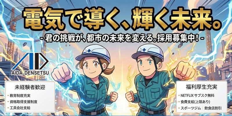 ■ 未経験を長期目線で育てる会社です アイダ電設は、経験者だけでなく、 建設業未経験の方や異業種からの転職も歓迎しています。 まずは資格を取り、現場経験を積み、 将来は一人で現場を任されるところまで育てていく。 そんな方針がはっきりしているので、未経験の方も入りやすい環境です。 いきなり放り出すのではなく、基礎を学び、先輩と一緒に現場を経験しながら成長していく流れです。 長く使える技術を身につけたい方に合う会社です。 ■ 東京都23区中心・屋内中心で働きやすい 現場は東京都23区内が中心です。 大手町、東京駅、有楽町、日比谷、銀座、虎ノ門、赤坂、森下など、都心部の案件が多くあります。 現場へは直行直帰なので、毎回会社へ寄ってから移動する働き方ではありません。 また、屋内工事がメインのため、暑さや寒さ、雨風などの影響を受けにくく、建設業の中でも比較的働きやすい環境です。 ■ 改修だけでなく新築も経験できる オフィスの入退去工事や改修工事がメインですが、一部で新築案件にも対応しています。 今ある建物を直す仕事だけでなく、建物を一からつくる流れにも関われるため、電気工事士として経験の幅を広げやすい環境です。 ■ 安定した案件があります 関電工の案件が中心のため、仕事量が比較的安定しています。 腰を据えて働きやすく、経験を積みやすい点も魅力です。 ■ 福利厚生も整えています 給与面だけでなく、福利厚生も整えています。 中小企業でも、働きやすい環境をきちんとつくっていきたいという考えがあります。 □ 社会保険完備 □ 住宅手当 □ 家族手当 □ 資格手当 □ 退職金制度 □ チケットレストラン □ ベネフィット・ワン □ 制服貸与 □ 道具類支給 □ 社用携帯貸与 ■ 相談しやすい環境です 現場への直行直帰が中心でも、社内LINEで日々相談しやすく、社長も現場に顔を出す体制です。 困ったことを一人で抱え込みにくいのも、この会社の良さです。