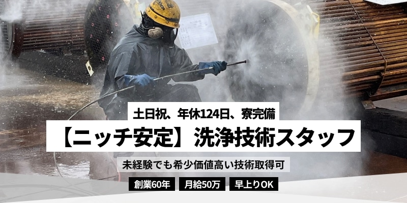 ●当社でないとできない特殊な仕事! ・産業用設備の洗浄は非常に特殊な工法を使用するため、 全国各地の大手企業からたくさんのご要望をいただいております。 ●仕事が早いため残業はほぼありません。 ・当社の職人は仕事が早く、スキルも高いため、残業する ことはほとんどありません。 ●未経験から高収入を目指せます。 ・実務経験3年で国家資格「産業洗浄技能士」を取得することが できます。特殊な仕事のため、技術を身につければしっかりと 高収入を目指すことができます。