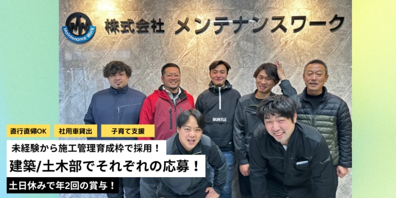 □□□□□□□□□□<注目ポイント>□□□□□□□□□□ ◆建築/土木の2部署での施工管理スタッフを募集中 ◆男性の育児休暇の取得実績あり ◆社内勤務の場合は出勤時間は相談可能!子育てとの両立可 ◆給与アップは年齢、入社歴関係なく個人を評価! ◆現場には直行直帰OK・希望者には社用車の貸与あり ◆若手〜60代まで幅広い年齢層が在籍・穏やかな社風の会社 □□□□□□□□□□□□□□□□□□□□□□□□□□□□ 株式会社メンテナンスワークは、大阪府堺市に拠点を構え 建築/土木の2事業での塗装工事・防水工事の現場管理を 行なっております。 \未経験積極採用中!施工管理スタッフ募集/ ◎建築工事 ◎土木工事 →それぞれの部署で施工管理スタッフを募集しております。 体制強化のため、未経験者を積極採用中! 施工管理の先輩、当社代表、営業スタッフも全員で 手厚くサポートするので、ご安心ください。 1名でも多くの方の目に留まり、面接でお会いできる ことを楽しみにしております。 ========= 【未経験の方へ】 ========= 管理業務と聞くと色々な仕事を押し付けられて忙しいイメージがあると思いますが、 弊社では1つの案件に複数名の管理担当者が付いて分担してこなしていきます。 1人で現場を任せられる実力がついたとしても複数人で確認し高品質と利益を 確保するためサポート体制は継続していきます。 ========= 【建築工事】 ========= ▼大手不動産会社からの依頼で、アパートや マンションの改修工事の現場管理を行なっていただき ます。 ▼外壁塗装、防水工事、付随する足場仮設などの 現場管理を担当していただきます。 ▼平均工期は2週間〜1ヶ月程度 (大規模修繕の場合、1年〜2年になるケースもあります) ========= 【土木工事】 ========= ▼公共事業(主に国交省、NEXCO等)での橋梁塗装、 補修・耐震補強工事などの現場管理を行なっていただき ます。 ▼工期は1ヶ月程度のものから、最長3年の大型プロジェクト まで現場の規模により大きく異なります。 ▼現場は関西圏〜全国各地、最近は四国地方の案件が多く なっております。 ▼宿泊先は基本的にビジネスホテルの個室となります。 出張先では観光やご当地グルメなど 好きに過ごしてOKです! //////////////// 【主な管理業務】 //////////////// ●現場管理 (工程管理・品質管理・安全管理・原価管理) ●発注者、協力業者との連携 ●書類作成(PC業務) ●写真撮影