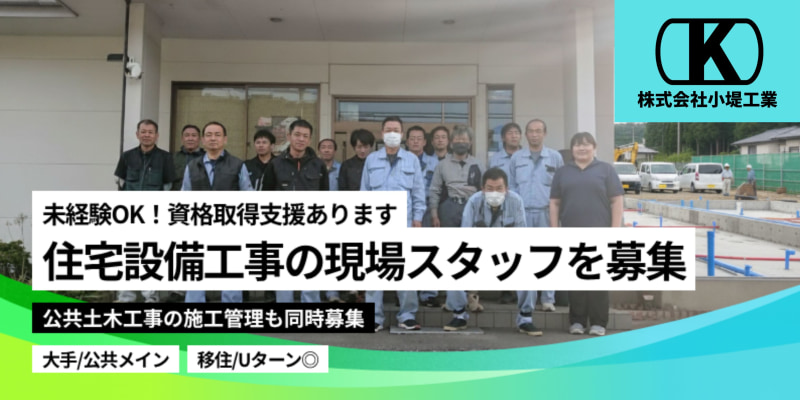 ===============《注目ポイント》=============== ◆住宅設備工事の現場スタッフ/公共土木工事の施工管理募集 ◆年間休日120日・土日祝休み ◆資格手当は最大で99,000円(毎月支給!) ◆資格取得の支援、合格時の祝い金支給もあります ◆大手ハウスメーカー案件/公共事業は自社での入札参加 =========================================== 株式会社小堤(おつづみ)工業の採用情報をご覧いただき、 ありがとうございます。 当社は『住宅設備』『公共工事』『プロパンガス販売』の 3つの事業を展開する会社です。 今回は『住宅設備』の現場スタッフ、 『公共工事』の施工管理スタッフを募集しております。 茨城県鹿嶋市への移住/Uターン希望の方のご応募も お待ちしています。 1名でも多くの方とお会いしたいと思います。 どうぞ、よろしくお願いします。 □□□□□□□□ 【住宅設備工事】 □□□□□□□□ 大手ハウスメーカーからの依頼で新築の戸建住宅、 アパートの住宅設備工事を行っております。 ※新築現場がメインですが、年数件ほどリフォーム工事 にも対応します。(トイレやお風呂のリフォーム) <主な作業内容> ◆屋外作業(約7割) ・上水道本管引込工事、下水道本管接続工事 ・上水道、下水道、雨水系などの配管布設 ・浄化槽設置 ・舗装工事 ◆屋内作業(約3割) ・室内の各種水回りの設備・器具取付など <POINT> *戸建住宅の場合、2名ペア/工期3ヶ月〜6ヶ月 *アパートの場合、4名1組/工期6ヶ月程度(2階建て/5部屋) *未経験の方はOJTにて仕事を学んでいただきます。 重機などの資格はすべて会社サポートで取得可能です。 *重機を使用した掘削作業などの屋外作業、宅内の配管など さまざまなスキルを学べます! また、たくさんの資格取得にもチャレンジしてほしいと思います。 (資格手当は最大99,000円/月) □□□□□□□□□□ 【施工管理スタッフ】 □□□□□□□□□□ 茨城県や鹿嶋市の公共工事、ならびにハウスメーカー などの案件での土木・管工事での現場管理をご担当していただきます。 <主な管理業務> ・協力会社の手配 ・現場での安全面、工程、品質管理 ・書類作成、写真撮影 など ◆主な施工事例 配水管布設工事(耐震化) 道路舗装修繕工事 道路排水整備工事 雨水管整備工事 大規模改造 機械設備工事(小学校) 防波堤ブロック製作工事 温水プール機械設備工事 など ※即戦力の方、1級/2級の施工管理技士(土木、管工事)を お持ちの方は優遇いたします。 ※将来的に施工管理へのキャリアアップを目指したい方も 大歓迎です。 ======<入社後のキャリアパス>====== 【入社〜3年目】基礎固め ■求められるスキル・経験 工具の名前や使い方、マナー(現場でのルール)を覚え、 作業の補助を通して現場の空気に慣れていただきます。 ■具体的行動例 作業に必要な技能講習なども受けていただきます。 【3年目〜7年目】一人前の職人へ ■求められるスキル・経験 一人前の職人として、簡単な現場を一人で任されるようになります。 ■具体的行動例 資格取得に向けて、専門知識を深めていく時期です。 【7年目〜】現場をまとめる存在へ ■求められるスキル・経験 現場の責任者を任されます。 ■具体的行動例 工事全体の進捗や品質を管理し、現場のリーダーとして活躍していただきます。