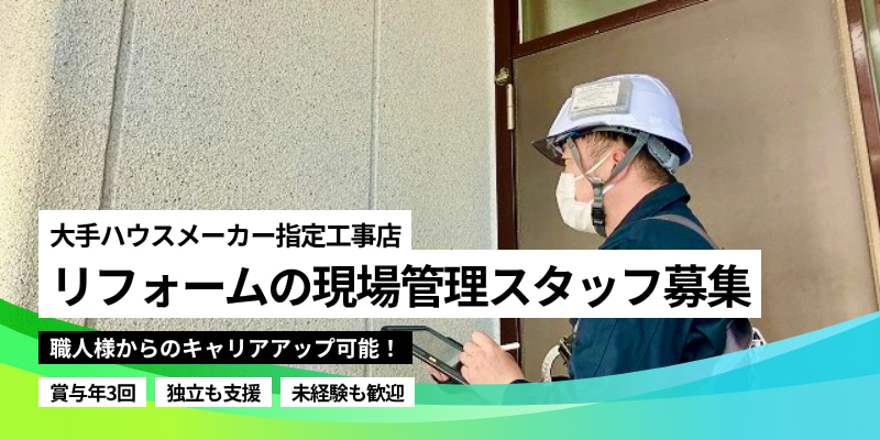 ⦅注目POINT⦆ ◆旭化成ヘーベルハウスの指定工事店で現場管理スタッフを募集中 ◆経験・性別不問で募集中! ◆外装・内装のリフォーム工事の現場管理 ◆入社後、職人へのジョブチェンジ可/独立も支援します ◆今後は休日数も増加予定/健康的に働ける環境へ! ◆賞与年3回は連続支給中!業績は常に安定しています <旭化成ヘーベルハウスの指定工事店> 防水工事から始まった事業が、今では内外装全般を請負う 総合工事店にまで事業を拡大してまいりました。 おかげさまで業績好調に伴い、社員採用を進めています。 経験・性別不問で現場管理スタッフを募集中。 7名の管理スタッフが在籍しているため、 しっかりと学べる環境が整っております。 お一人でも多くの方にご応募いただきたいと期待しております。 どうぞ、よろしくお願いいたします。 《仕事内容》 外装・内装のリフォーム工事における「管理主任」として現場管理をご担当していただきます。 □主な現場 ・旭化成ヘーベルハウスの指定工事店として、戸建住宅/マンションの内装工事、外装工事のリフォームを行なっております。 *マンション大規模修繕工事の管理も担当していただけます。 □担当していただく管理業務 ・元請の担当者との打ち合わせ ・居住者への工事の説明 ・そのほか現場のフロントに立ち、さまざまな対応を行なっていただきます。 ・現場管理(安全、品質、工程) ・資材の手配 ・書類作成、写真撮影等 ━━━━━ 【POINT】 ━━━━━ ◆さまざまな施工に管理者として携わることができます! ・外装(塗装、防水、太陽光) ・内装(大工、設備、電気、クロス、美装など) 多種多様な職人さんと接する機会がありますので、他社では経験できないこと、幅広い知識を得ることができます。 ◆未経験の方は先輩に同行して管理業務を学んでいただけます! (現在7名が管理者として在籍しているので 独り立ちできるまでしっかりと指導します) ◆規模の小さな案件から対応していただき、ゆくゆくはマンション大規模修繕工事にも対応していただきます。 (平均3〜4階建てマンション/10階以上のマンションにも対応します) ◆工期 ・戸建住宅は1週間以内の短期の場合が多く、複数の現場を並行して管理するので、日々転々といろんな現場に行くイメージです。 ・マンション大規模修繕は6ヶ月ほどの工期となります。