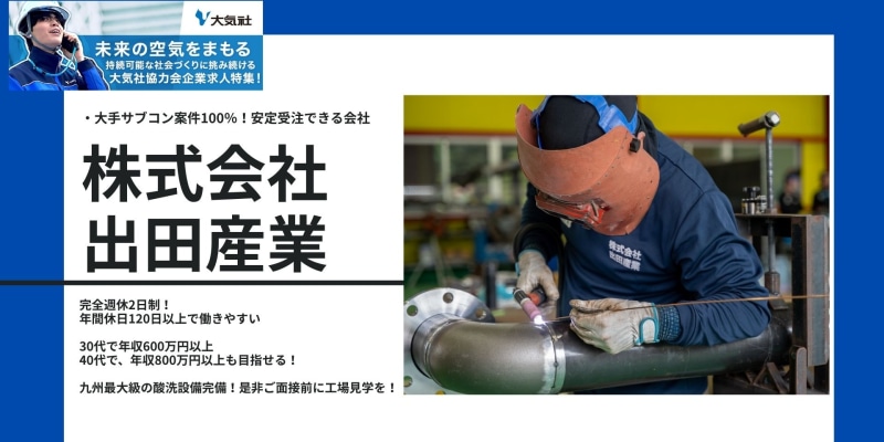========【注目ポイント】======== ◎ 完全週休2日制!年間休日120日以上で働きやすい ◎ 現場負担を軽減!工場でのプレハブ加工を導入 ◎ 面接前の本社工場見学OK!技術力の高さを体感できる ◎ 大手サブコン案件100%!安定受注できる会社 ◎ 社員同士の交流が活発!趣味を楽しむ仲間が多数 ======================== 「高品質な配管工事」を支える技術と環境がここに。 出田産業は大手サブコン案件を中心に、 半導体工場や商業施設などの 大型物件の配管工事を手がける安定企業です。 私たちの強みは、現場の負担を軽減する 工場でのプレハブ加工と、九州最大級の 酸洗設備を活用した高品質な施工です。 作業効率の向上と安全性の確保に力を入れています。 チームで働くやりがいを実感できる環境を整えています。 より良い環境でスキルを磨きたい方は、 ぜひ面接前に工場見学へお越しください! 当社の技術力や働く雰囲気を体感していただける自信があります。 【具体的な業務】 主に半導体工場や商業施設など、 大型物件の配管工事を担当します。 ・客先との打ち合わせ ・設計図の作成 ・工場への製作指示 ・現場作業 ・工事積算業務 ・見積もり作成 ・安全活動 【働く環境】 建物種別:半導体工場、商業施設 施工規模:大型物件の配管工事を担当 施工期間:案件による 作業員数:3人1チームが基本 ※自社工場では常時20〜30名がものづくりを担当しています。