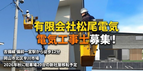 【岡山市】住宅の電気工事スタッフ|経験者は月給40万〜・年収500万可|固定残業なし|退職金制度あり