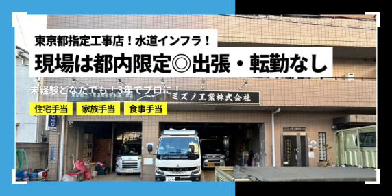 【元請け直請けだから安定×都内限定】水道局指定工事店で未経験から2.3年で一人前に!住宅手当あり