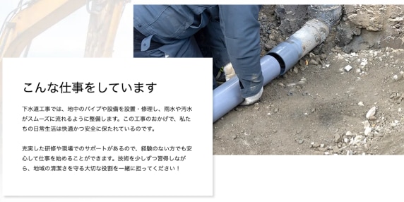 水道工事、重機オペレーター、施工管理(土木)、施工管理(管工事)、土工、衛生(ガス)、衛生(水道)、舗装、エクステリア・外構、インターロッキング
