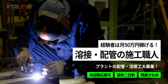 【移住支援拡大、寮完備、月の残業5時間!】経験者月50万円稼げる!プラントの配管・溶接工大募集!