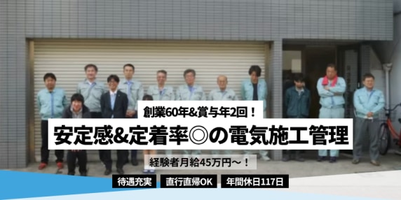 【年間休日117日】経験者月給45万円も可能&長期連休も取得可能!電気施工管理募集!直行直帰OK!