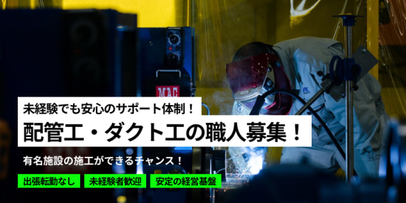 有名施設の設備工事に参画!配管・ダクト職人募集|未経験者も大歓迎◎・出張転勤なし|大手取引で長期安定