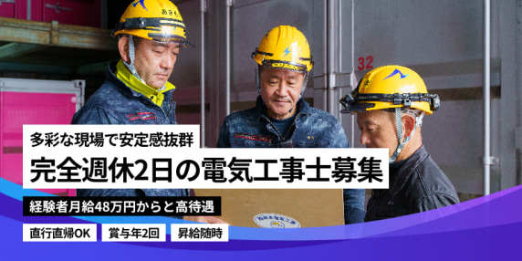 【入社5年で600万円目指せます!電気工事士&施工管理募集】賞与最大年3回/残業月10時間以下