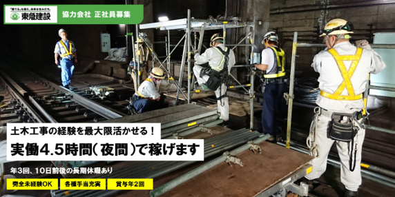 【直行直帰/年3回10日前後の長期休暇】東京・神奈川/鉄道土木の作業員│夜勤手当で効率よく稼ぐ