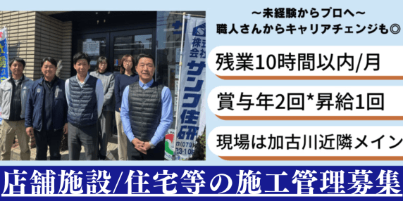 店舗や住宅の施工管理スタッフ募集◆賞与2回/月残業10h以内◎未経験歓迎/転勤なし/住宅や家族手当有